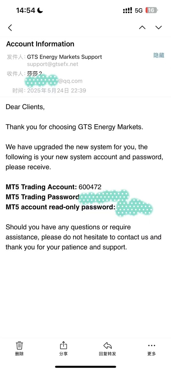 尊敬的平台: GTS在2025年4月30日把我老系统313252换成了8字开头的系统,又在2025年5月24日,换成了6字开头的系统,他们有联系国内团队长说把资金调到新系统上,原来帐上的资金数据变成了信用分无法提现,国内平台负责人找不到,恳请平台要回我的本金。