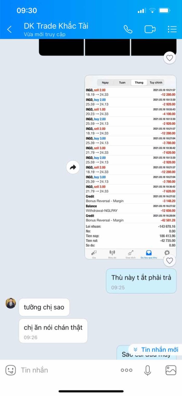 Lừa đảo, ăn cháy trên tk của khách, nó cho mua cp gần cháy nó bắt vào tiền để gồng. Đến khi phát hiện ra mánh khoé của nó thì nó lừa mua mã ingo của sàn nó. Trong 30p cháy 134k