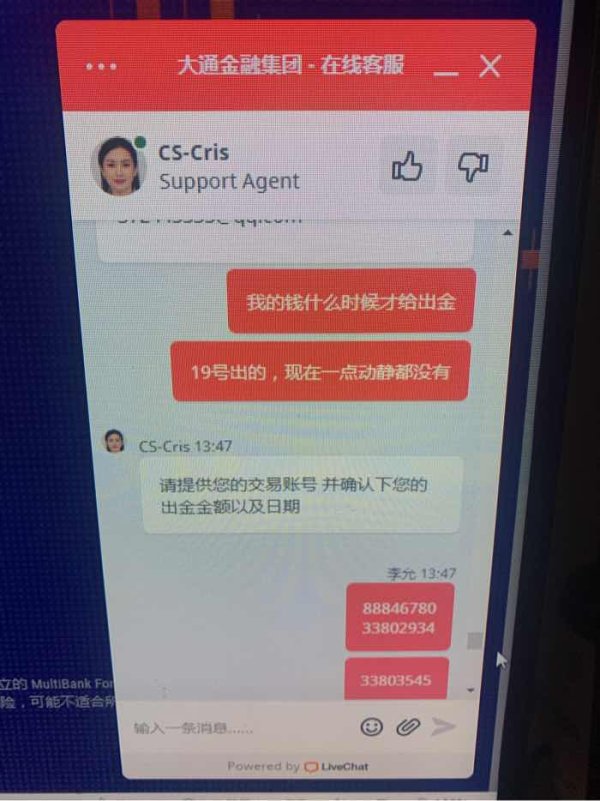 大通金融一次又一次的欺骗消费者,2个月时间,换啦各种借口,就是不让出金到账。