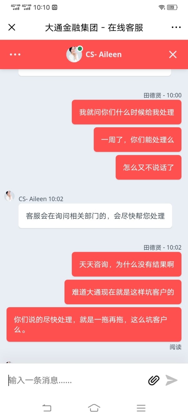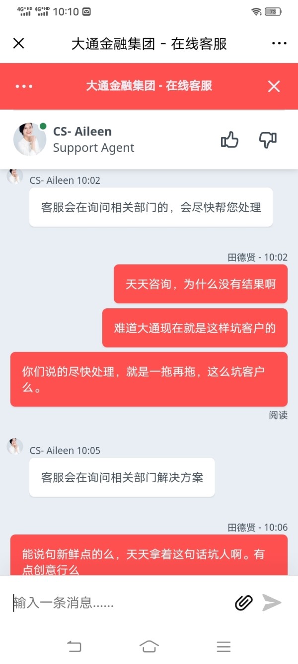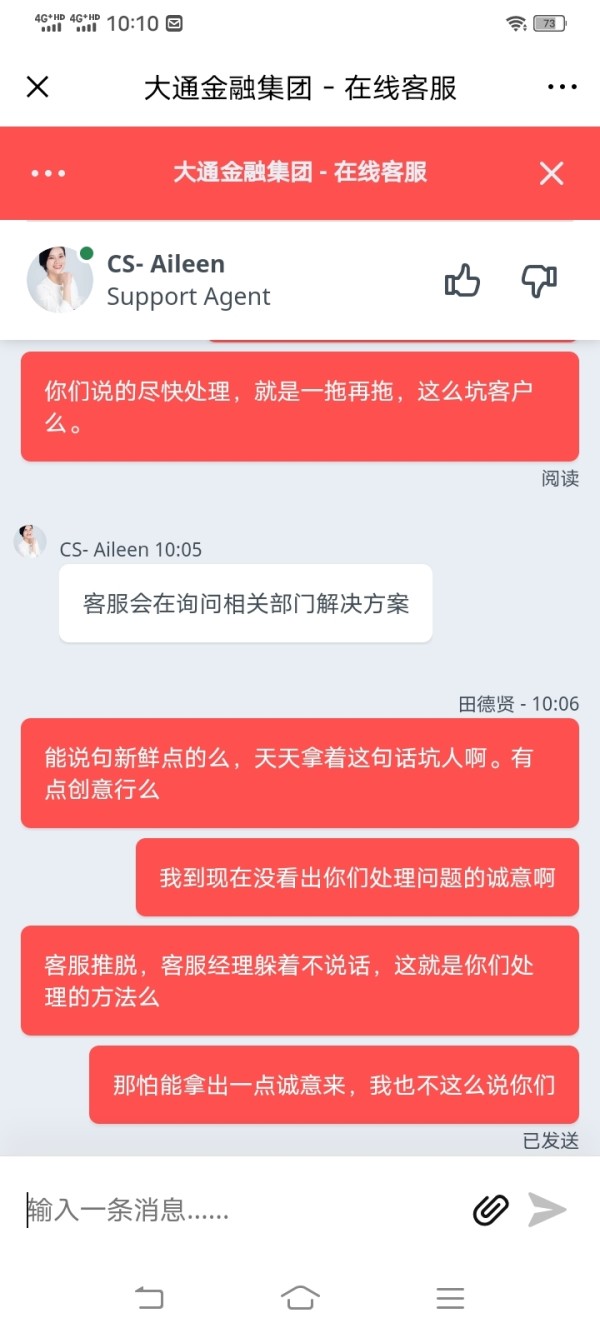因为他们后台出问题,客服经理不说话,客服人员推脱责任,整天就是想着怎么欺骗隐瞒客户,自己说两天解决问题,一周没见回复,说的平台百分之五十强平,客服经理一周了才给回复,说不管,金额太小了,这是人能说出的话么,大通金融,改制以后就是一个标准的骗子公司