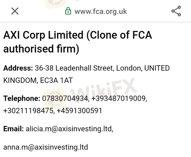 एफसीए ने AXI Corp Limited नामक ब्रोकर के खिलाफ अपनी आधिकारिक वेबसाइट पर चेतावनी जारी की है। AXI corp Limited एक नकली संस्था है जो प्राधिकृत ब्रोकर AXI के नाम पर वित्तीय एवं निवेश सेवाओं का संचालन कर रही है। इस नकली संस्था के खिलाफ गुरुवार को एफसीए ने औपचारिक चेतावनी वेबसाइट पर जारी कर निवेशकों को सचेत किया है। अगस्त 2018 में AxiCorp ने ऑस्ट्रेलियाई ब्रोकर के रूप में एक वित्तीय बाज़ार का अधिग्रहण किया था और आज इस ब्रोकर को Axi Financial Services यूके लिमिटेड के रूप में जाना जाता है। एफसीए ने दावा किया कि AXI लंदन में फिंसबरी मार्केट आधारित ब्रोकर है। वहीं यह फर्ज़ी संस्था लीडेनहोल स्ट्रीट में स्थापित होने का दावा करता है। एफसीए ने वेबसाइट पर केवल इस नकली संस्था का पता, फोन नंबर और ईमेल का खुलासा किया है परन्तु इससे संबंधित वेबसाइट का खुलासा नहीं किया। यह संस्था प्राधिकृत ब्रोकर AXI की आड़ में लोगों को वित्तीय सेवाएं प्रदान कर रहा है एवं एफसीए द्वारा पंजीकृत व प्राधिकृत होने का दावा कर लोगों को ठग रहा है।