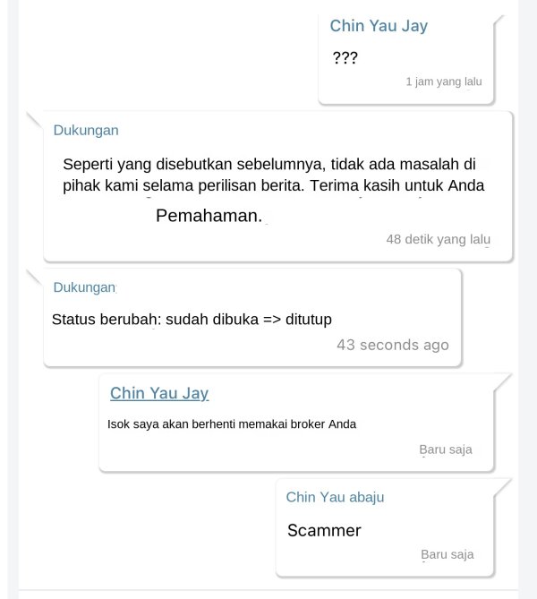Berita CPI keluar jam 8:30 malam, saya masuk trade jam 8:29 malam. Data saya lancar sampai menunggu berita. Jam 8:30 malam tiba dan chart broker lag selama 2 menit. $200 USD meledak. Broker bilang mereka tidak ada masalah, dari sisi saya, broker lag beberapa menit lalu kembali normal. Data saya saat itu lancar tanpa masalah. Live chat tidak membantu dan menolak mengembalikan deposit saya. Hanya berdalih karena mereka tidak mau mengembalikan uang.