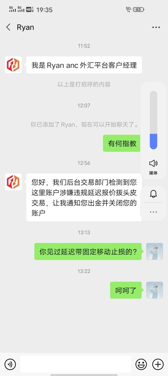 开户之前很明确的表示禁止延时ea,其他都可以。盈利之后秒变脸。说你违规,私自把盈利金额抹除,拒绝出金。一开始威胁你,要承认全部都是自己的错,不然不给出金。威胁不成就开始忽悠,让你手持身份证录制视频说自己的名字和身份证号等等,才给出金。手持身份证录制视频只有开户和销户才可能用的到。在这忽悠谁呢,自己信吗?是不是用了延时ea,工作人员可查看并为我作证!