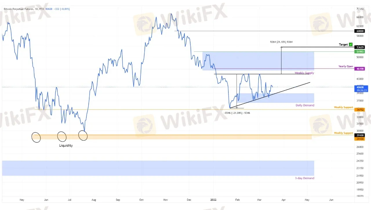 Harga Bitcoin menetapkan tiga level tertinggi yang sama dan empat level terendah yang lebih tinggi sejak 22 Januari. Titik swing ini dapat dihubungkan menggunakan garis tren untuk membentuk segitiga naik. Formasi teknis ini memperkirakan kenaikan 21%, diperoleh dengan menambahkan jarak antara swing tinggi dan rendah pertama ke titik breakout di $44.418.