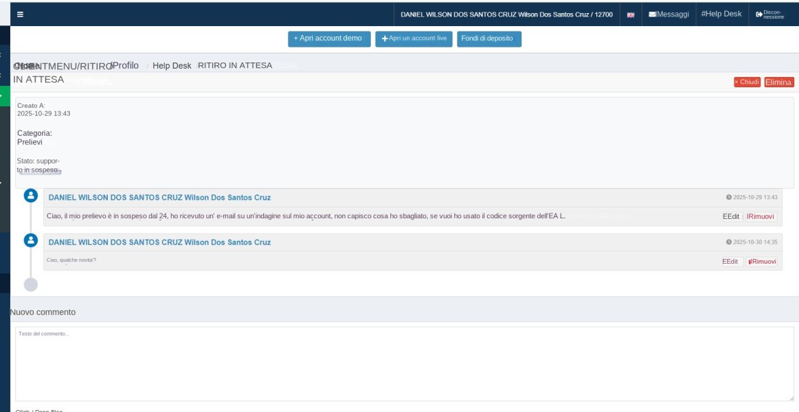 State alla larga da questo broker truffaldino. Ho realizzato un profitto e ho richiesto un prelievo una settimana fa, ma è ancora in sospeso. Ho aperto due ticket, ma nessuno ha risposto.