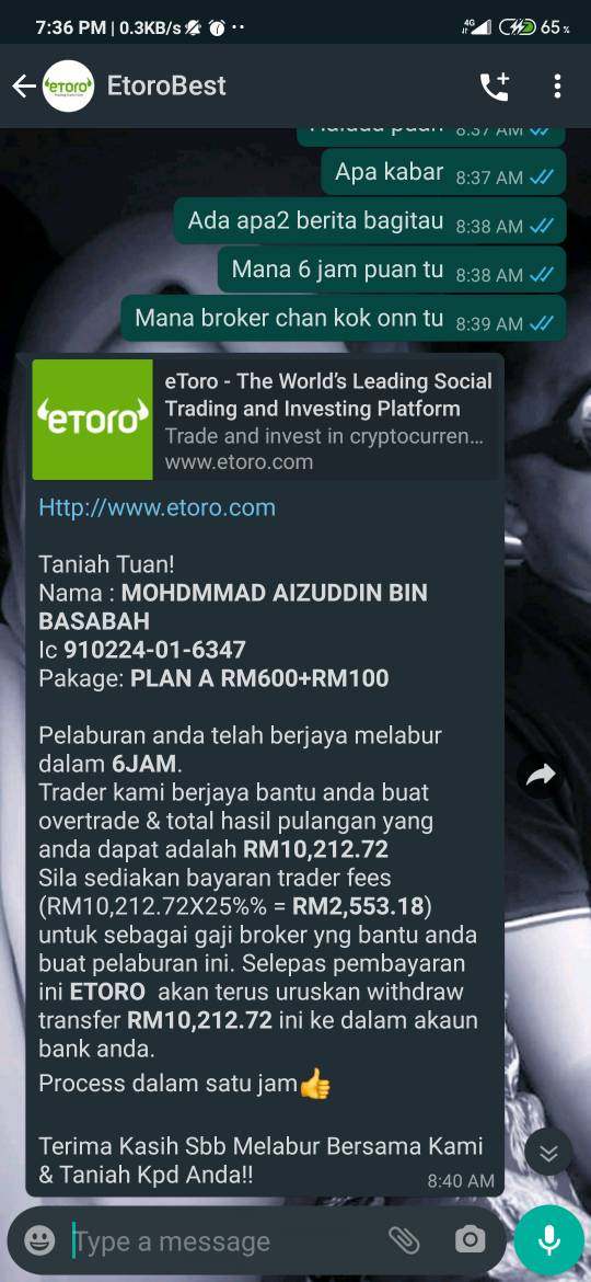 This broker did not ask any advance charge and promised within 6 hours can withdrawed directly. However, she didn't informed me in time and sent me as screenshot attached that I need bank in some cash to allow transfer process. This is scam and burn my cash about RM600. So i decided to refer this platform to let anyone bewared some kind of scam are still active.