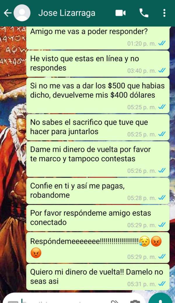 Hola Amigos! Hace tiempo una persona llamada José Lizarraga me contacto por Whatsapp y me invitó a usar e toro, me dijo que con $400 dólares podía empezar a generar grandes ganancias, el funcionaba como intermediario con el broker el me ayudó a crear una cuenta y todo eso, yo le deposite a el $400 por qué el decía que el me iba a regalar otros $100 para que el los depositara en mi cuenta, después del depósito ya no me responde nada