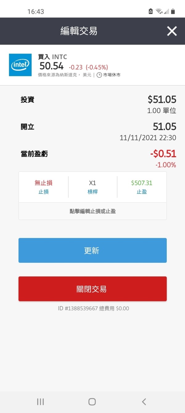 2021年11月10日,intc的收盤價是50.76。 On 2021 Nov 10, intc closed at 50.76 . 11月11日,我在50.76掛買單。 On Nov 11, I placed a buy limit order at 50.76 . 然而,etoro故意解讀成比市價50.75高1分。 However, etoro strategically interpreted as that my order was 1 cent higher than market price, 50.75 . etoro把我的買單成交在開盤跳空價51.05。 etoro filled my buy order at 51.05 , which was the open price on Nov 11.
