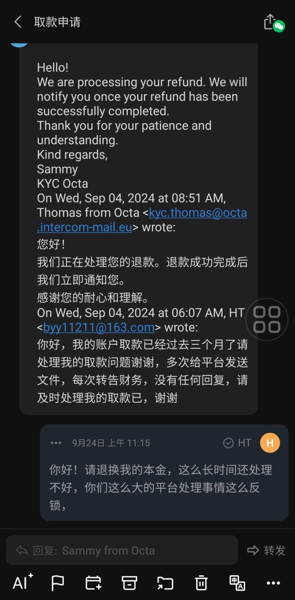 我是6月17日入金9900到octa平台,因为平台有赠金活动加上高杠杆,在一个月时间里,我的资金就翻倍了,这时我想把盈利的资金取款,平台拒绝我的出金,让我提供KYC,和三个月的USDT钱包的流水,提供之后,平台说我违规交易,但是,我是正常交易 ,手动下单,不会延时,不会推盘,要扣除我的盈利,想着退回本金就算了,现在过去马上三个月了,本金迟迟不给出金,每次用邮件和平台沟通,平台的回复,正常处理的你的出金问题,或者已经转交到财务部门,希望通过天眼让平台正确的对待这次的问题,谢谢