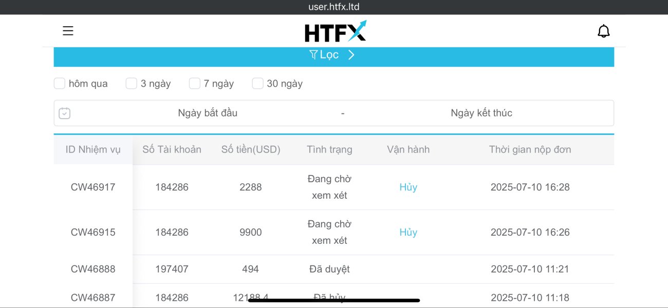 Tôi tên là Đỗ Hồng Nhung, hiện đang sinh sống và làm việc tại Việt Nam. Tôi mở tài khoản giao dịch tại sàn HTFX từ khoảng tháng 12/2022. Gần đây nhất tôi có nạp 15.000 USD ( tháng 6/2025 ) để giao dịch nhưng sau một tháng giao dịch không hiệu quả , thua lỗ nên tôi quyết định làm lệnh rút tiền. Ngày 10/07/2025, tôi tiến hành làm 2 lệnh rút tổng số tiền 12.188 USD từ tài khoản giao dịch về tài khoản ngân hàng cá nhân. Tuy nhiên, đến nay (ngày 29/07/2025), lệnh rút vẫn chưa được xử lý dù tôi không vi phạm bất kỳ quy định nào của sàn, không nhận được lý do rõ ràng hay bất kỳ phản hồi chính thức nào từ phía HTFX. Tôi đã gửi nhiều email và tin nhắn yêu cầu giải thích, nhưng đều bị phớt lờ hoặc trả lời vòng vo, không cung cấp thông tin cụ thể về thời gian xử lý rút tiền. Điều này khiến tôi nghi ngờ sàn HTFX có dấu hiệu chiếm dụng vốn của nhà đầu tư, không đảm bảo quyền lợi hợp pháp cho khách hàng.