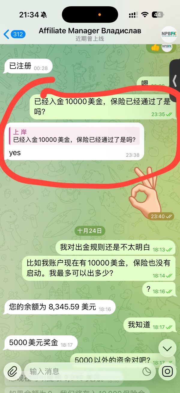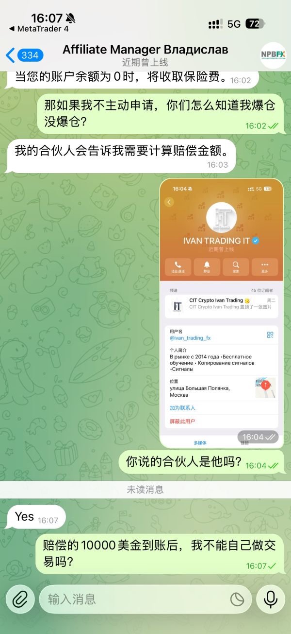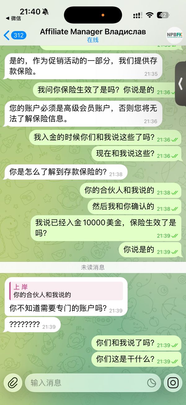 2025.10.13刚开始我入金5000$,我在NPBFX跟单平台和一个俄罗斯人进行交易,期间一直亏损状态,然后俄罗斯的那个人和我推荐保险,保险的内容是我再次入金5000$,总共入金超过10000$就可以有保险保障我的亏损,爆仓以后可以赔偿10000$。并且我和NPBFX经理确认了这件事情,2025.10.22我再次入金5000$,我和经理确认保险已经生效,。2025.10.30发生爆仓,我和经理索要10000$的赔偿,他们以我没有开通另外一个账户为理由拒绝我的赔偿。这是一家诈骗平台,不要在这里交易。