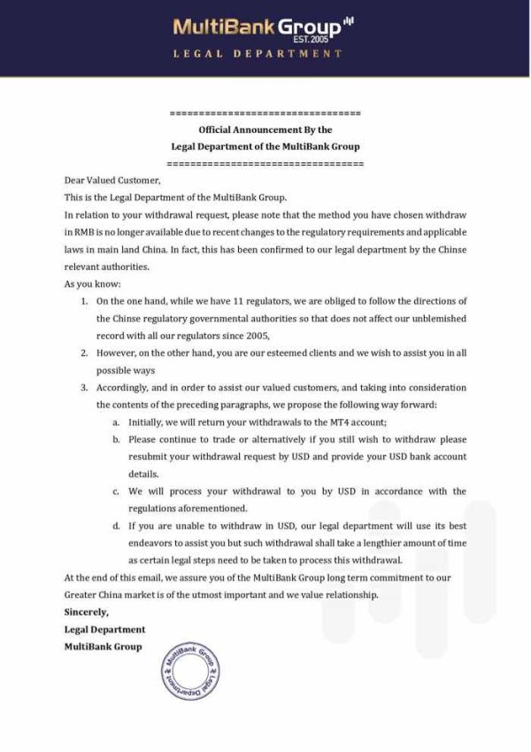 MultiBank Group引き出しは許可されておらず、米ドルでの電信送金による引き出しが必要です。この戦術を再び使用します。これは明らかに詐欺です