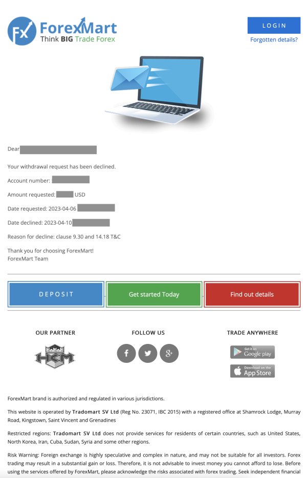 これまでで最高のブローカーであり、すべてのシステムが整っており、支払いが非常に高速です。支払いとプラットフォームの実行の両方ですべてがスムーズに実行され、引き出しはタイムリーに行われます.プラットフォームは優れています。 ForexMart は最高です。それらと取引し、他の詐欺ブローカーに陥るのを避けてください。