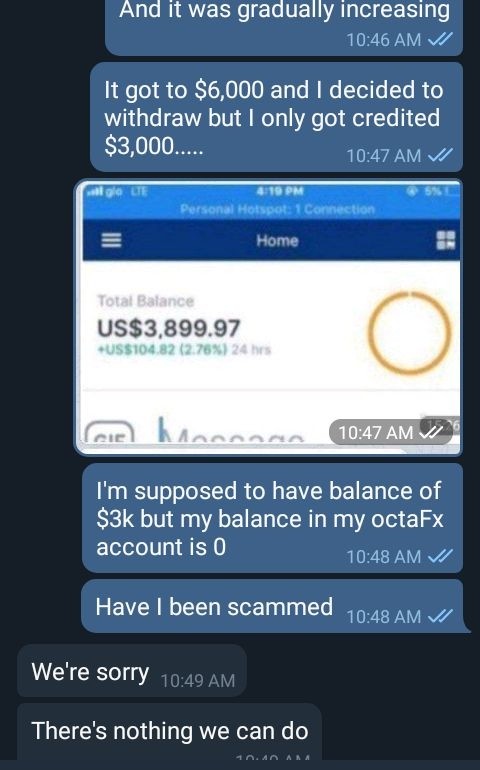 i invested $1k in octaFx, traded till it became $6k and decided to withdraw....I was only credited $3k and my octaFx balance went to 0. I complained to the customer care but they said there is nothing they can do😓