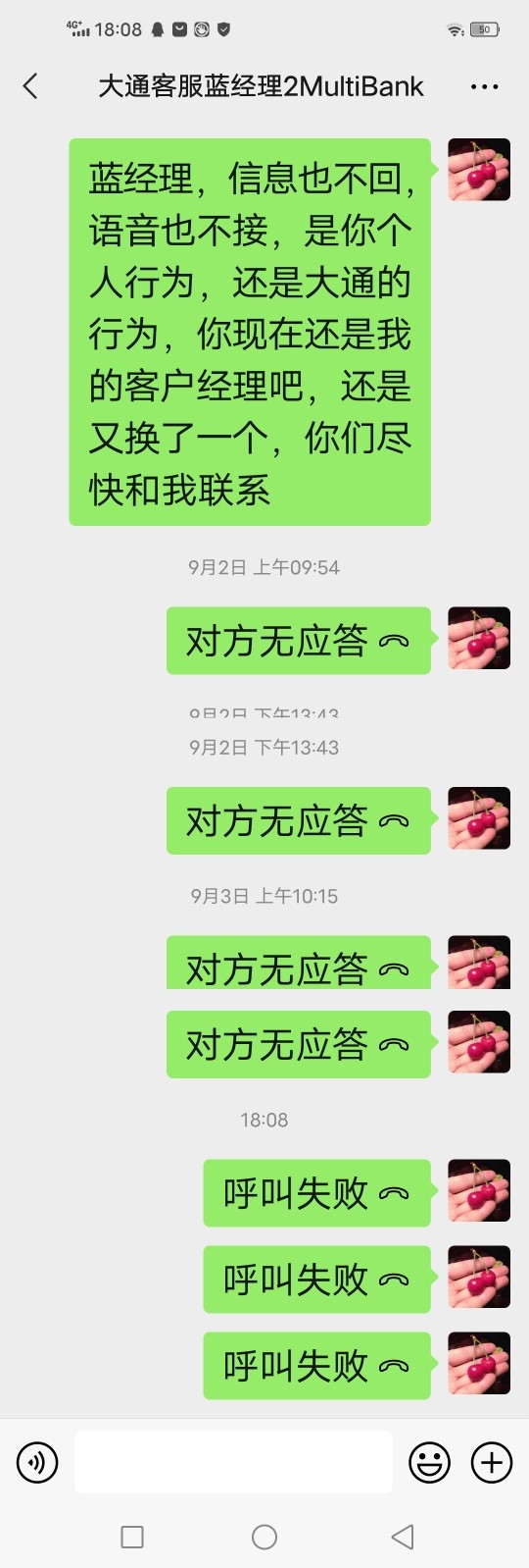 大通金融,技术问题,无法入金导致我爆仓!客户经理不负责任,现在把我拉黑了!企业QQ号也没人接,没人回。大通金融赔偿我的损失,还我公道!