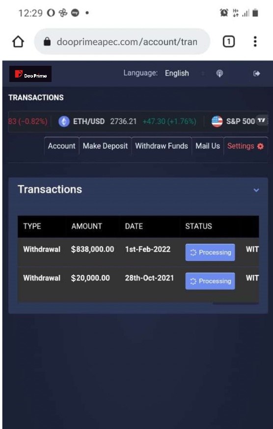 This company forces it's investors into depositing more money to their platform but when I asked them to send my funds out they became silent and ignored every advance I made to them in an attempt to get back my funds had to request a refund that came under fintrack/ org Whatever you do never invest your money in Doo Prime, they will delay the withdrawal forever if possible