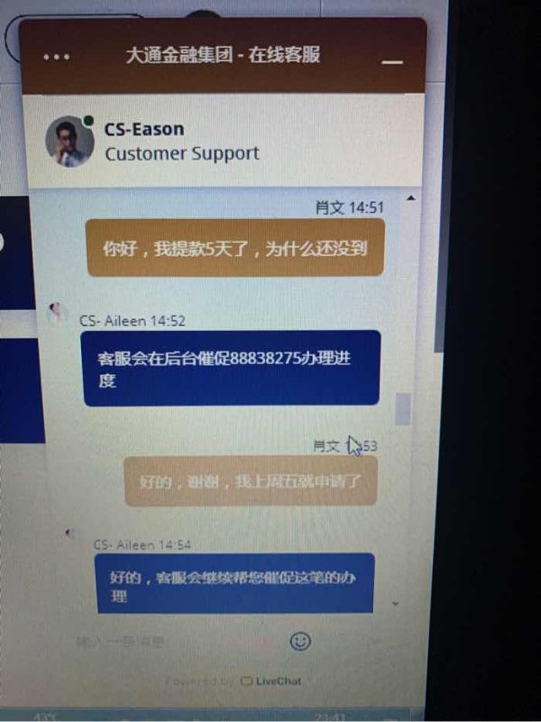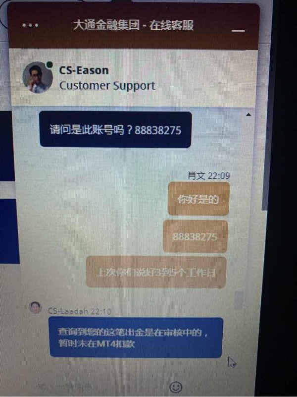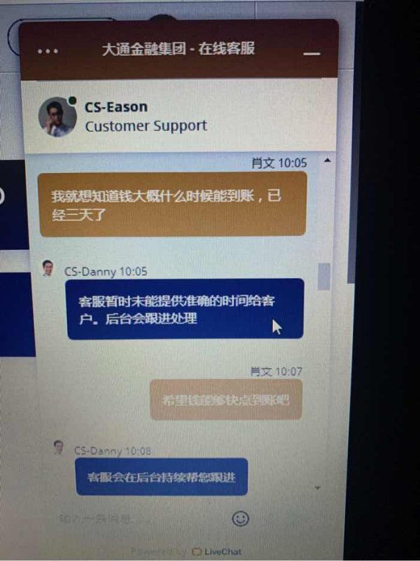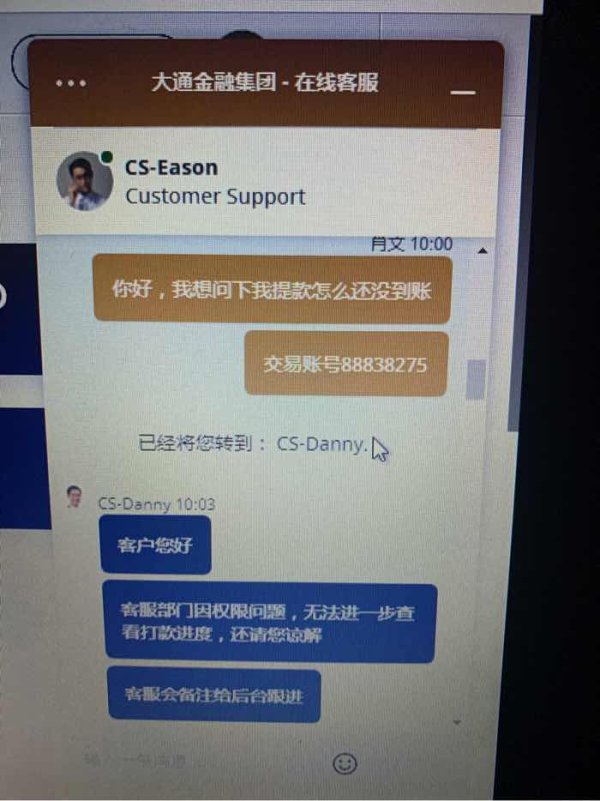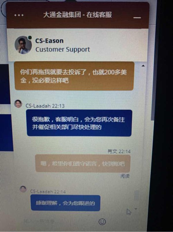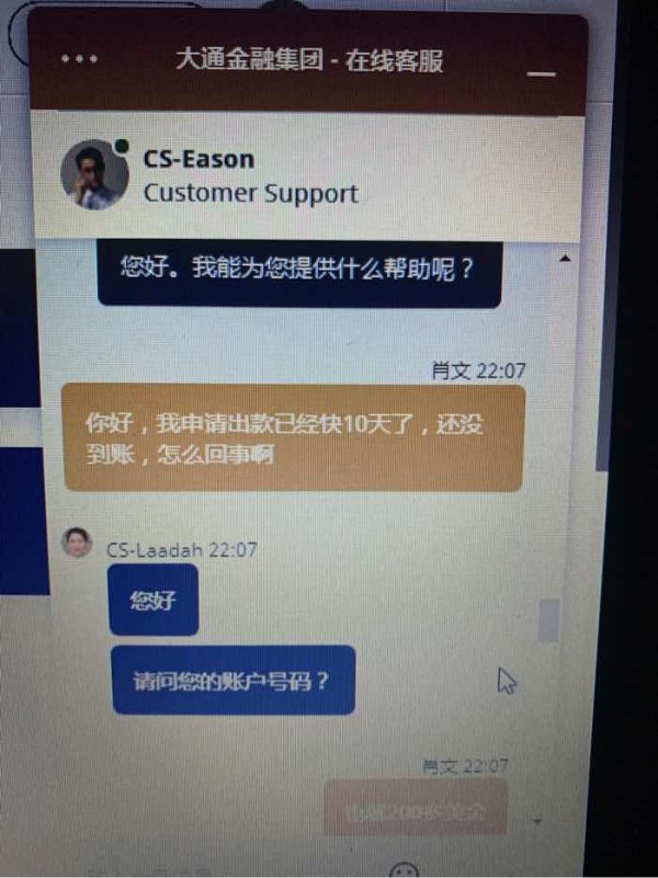 大通金融不出金,12月10日申请出金230美金,至今已20天不到账,客户这里就是拖延,没有明确答复