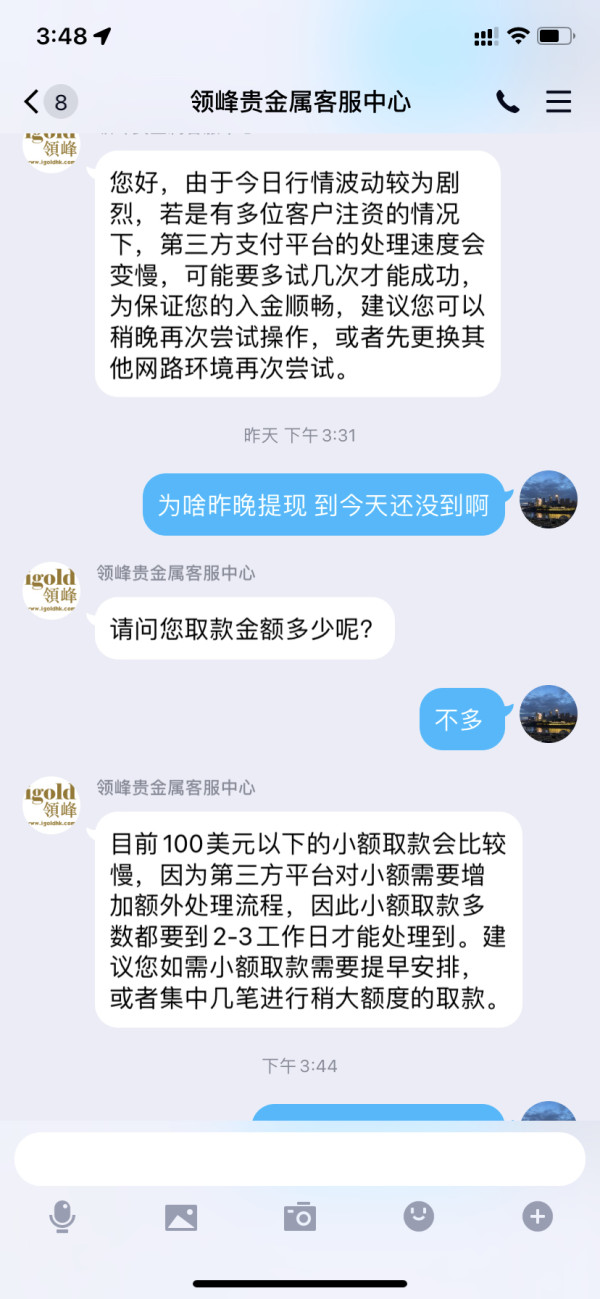 说是24小时随时出入金,然后又告诉我金额太小,比较慢,是想多篇我点钱进去?