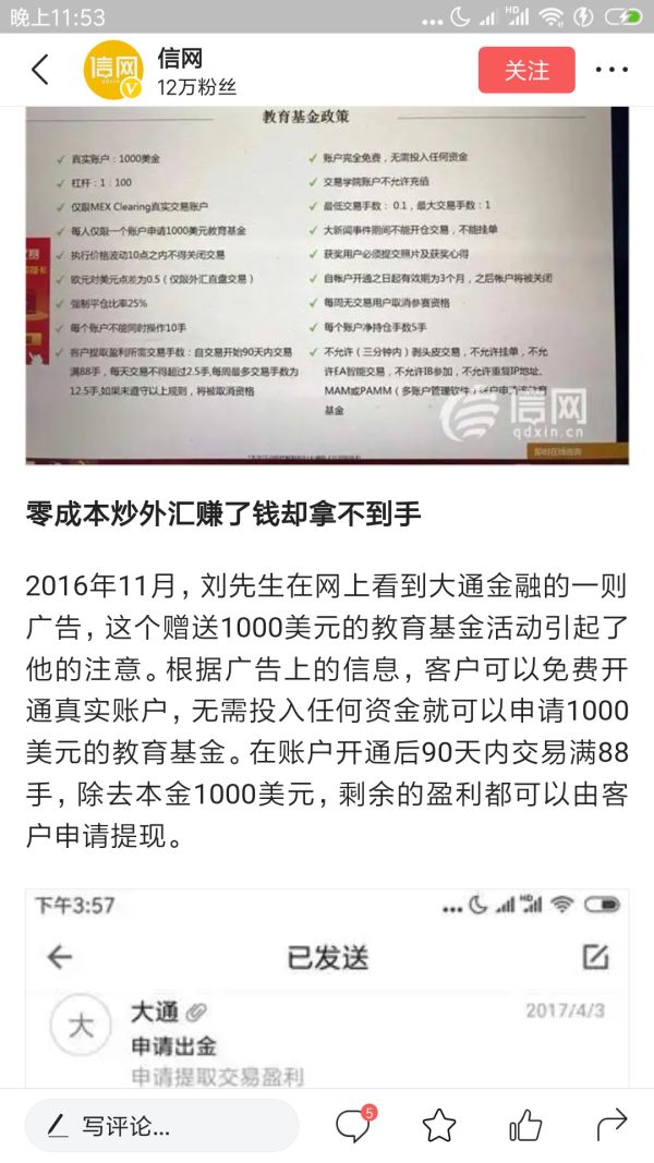 垃圾大通金融黑平台真实账户赢利不给出金,炒外汇赚了,大通不给出金,2年了刚回复http://m.sohu.com/a/165093388_120869你给一个赢利2千多美金做满88手出金,我赢利2万多美金做了110手怎么没人和我联系出金,当时那客服也是说要100手才能出金,后来又改了规则改做满88手就可以出金,我在2017年1月16日就做够100手申请出金当时等了4个交易日没人回复也没交易,到你们放假了我又继续交易110手直到2017年2月1日你们突然停止比赛禁止交易了,事先无任何提示公告,我账户还没交易到3个月就关闭,如果不是上次申请出金耽误几天没交易到2月1日不用说100手120手也够了,你们之前不限制手数到限制每天不超过10手又到每天限制平仓手数2.5手,有很多次应该平仓缺怕超了手数等待隔天本来赚的变成赔的单子赔钱的单子还不愿平仓致使等待盈利才平致使我做了2个多月才做110手,账户还没到3个月就关闭交易,频繁修改规则,之前说好88手然后又改100手又改120手又改88手,哪有这样欺骗消费者,为了防止出金提前2017年2月一号停止比赛关闭账户不给出金http://m.qdxin.cn/detail/164105.html https://weiquan.fx110.com/exposure/2195 关于账户收到第二次1000美金教育金是你们请我做的我当时也问了当时客户经理和你们官方给我回复没有问题可以继续交易赢利也可以提取,如果不确定我能做吗,平台我没有挂单那是止盈的订单,如果挂单不可能精确到点差后面小数点,我不能一直盯着看盘一开始几单设置止盈了,盈亏不到10点订单不算手数,哪有这样的道理,照这样说我看着k线往亏损方向走了我不平仓吗必须等亏损10个点以上在平仓吗,这点明显暴露黑平台不给出金,还有你们之前的规则是没有限制手数到限制每天不超过10手再到每天只能做2.5手,我也是按照你们规则时间段做的,不给出金到哪里都说不通,就算挂单盈亏10点不算手数,就按你们给我发的有效订单我算了是101.7手,之前做的手数也是按照当时规则做的,还有我在2017年1月17日就做够了88手申请出金等了4个交易日你们没回复,后来我问客服说要100手才能出金我就继续做到2017年2月1日所有人不能下单停止比赛按2016年11月21日开始交易我还差20天交易时间,你们这是不讲诚信故意不出金 http://m.sohu.com/a/165093388_120869 https://weiquan.fx110.com/exposure/2195 你们给一个赢利2680美金出金我的2万多美金你们怎么没出金想花的小钱了事啊,我看那个姓周的记录比我晚交易2礼拜你们计算他手数比我做得多可能吗我是按照你们每个阶段规则做的之前有做过每天5手怎么不算到哪里也说不通,原来你们是黑平台利用比赛故意骗人,赠金按手数完成提取赢利听起来没错,正常经纪商应该只是赚每手交易点差,而你们在完成一定的手数赢利你们不给出金无意暴露就是对赌黑平台,从17年之后你们又改名字换地址换微博换注册公司小额出金来敷衍了事