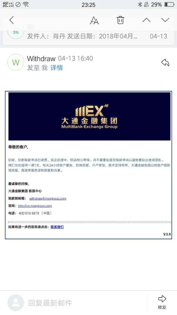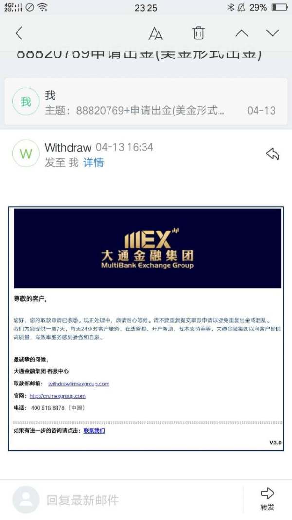 大通金融出金处理极其缓慢,之前的曝光为什么帖子也没有了,我们要拿回自己的钱,又不是赚的平台的钱,就是自己的本金,怎么就这么难呢,这是我们自己的血汗钱,不是你们大通金融平台的资产,希望平台正视这个事情!不要用各种理由拖延推脱责任!4月13号提交的出金申请,到现在多少天了,天天求爷爷告奶奶!马上5月8号,快一个月了!发现客户在平台面前真的好弱势, 已经无力去骂大通好或者坏,把钱还给我们就行了! 跪求大通金融的领导们可怜可怜我们这些散户,把我们的钱还给我们!