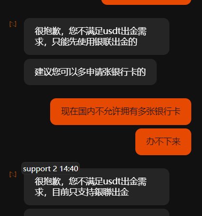 销售经理沟通的时候说明可以U进U出,后面出金的时候又说不符合U出金的要求,只能出银联!后面客户经理完全联系不上,官网在线客服一直都是踢球一样从来不解决问题,黑平台,两百U都黑!!!大家擦亮眼