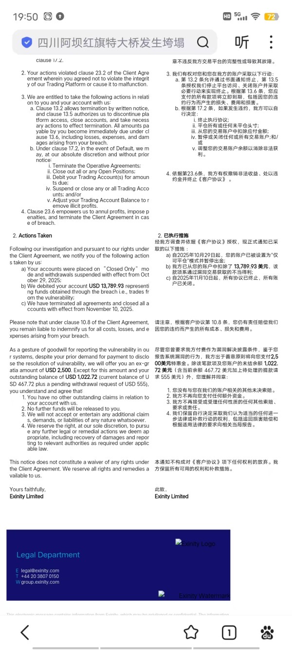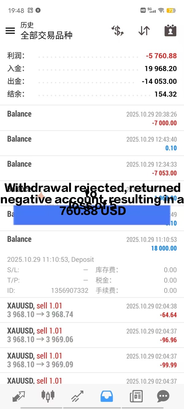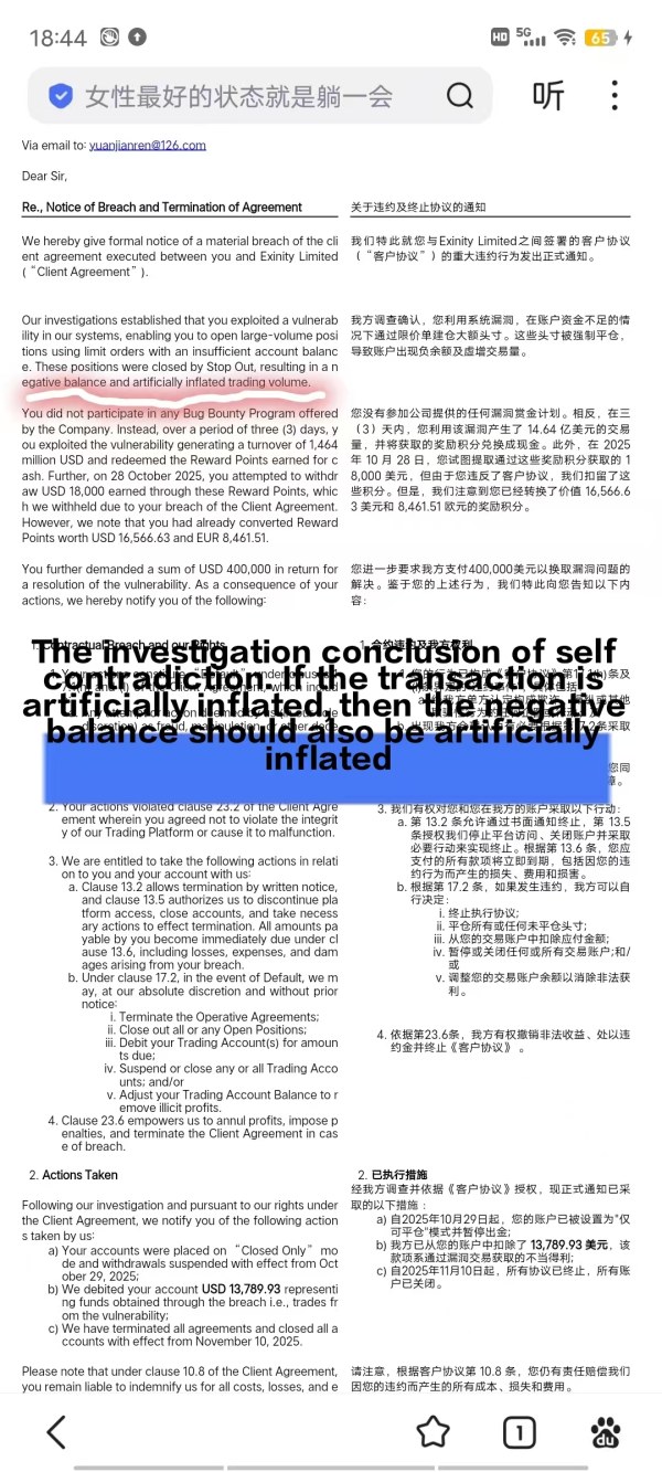 FXTM 公司的下单是可以叠加的,比如你账户里就800保障金,按他们公司本来的原则是只能下1手黄金,但是因为他们系统有时候会延迟或是啥的,有时候会同时出现两个同样的单子在里面,那么你会突然同时进去2手黄金,直接导致爆仓,因为这种事情已经导致本人几次损失,但是本人从来没要他们公司赔偿,2025.10.27号我试验了同一个产品同一个价位下了两单,发现他们系统是可以同时买入的,这个不是巧合,结果我损伤了钱,我重新试验了一下发现贵公司的系统确实存在这个问题,这不是巧合。本人于2025.10.28号发了6次信息和邮寄给FXTM公司,诉说贵公司系统存在问题,并询问有没有发现问题奖励,希望有个30w交易积分奖励,但是FXTM公司无视本人,直接拒绝。本人不是贵公司员工,不存在给他们公司免费打工的问题。而且他们公司无视了本人的发现,那么就是认为他们公司的系统没有问题,他们的系统是正常的,只要按照他们系统的规则下单就行了。然后本人遵照FXTM公司的系统和操作,将操作方式分次化进行,完全是遵循贵公司的系统和规则。然后本人2025.10.29出金18000,FXTM公司拒绝本人出金,并把出金金额返回到负数账号,导致本人直接损失5760.88美金,并且本人所有的账户都被锁定,不能交易不能出金只能入金,期间本人多次和FXTM公司联系,FXTM一直无视本人。2025.11.3FXTM公司直接没收本人账户13789.93美金,账户仍处于锁定状态。到11.10之前他们公司一直不和本人沟通商量解决事情,于11、10直接单方面撕毁协议,还所谓的善意补偿本人2500美金来羞辱本人。 首先,发现这个问题并非偶然,而是FXTM富拓因系统问题导致我损失的反复和长期交易的结果。例如,如果账户中有800美元,由于系统问题,我一次只能下一个标准订单。有时,他们可能会重复下同一个订单,导致清算。经过几次重复,我发现FXTM富拓的系统允许您在同一时间输入相同的订单,而不管您的保证金是多少。我从未要求FXTM富拓赔偿这些损失。如果FXTM富拓想追究此事,我是否应该追究此类赔偿。 其次,在发现问题后,他们立即向FXTM富拓公司报告。他们完全无视客户的发现,这意味着FXTM富拓单方面认为他们没有问题。我们可以说FXTM富拓允许此类操作作为正常操作。 第三,问题发生后,FXTM富拓在没有任何沟通、电子邮件反馈或协商的情况下单方面