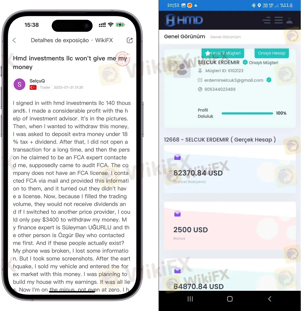 Há alguns dias, um investidor turco “SelçuQ” confidenciou ao WikiFX que seu investimento na plataforma “HMD FX” (Hmd Investments LLC) foi profundamente fraudado, ele não conseguiu sacar dinheiro e seus ativos voltaram a zero e expôs o todo o processo do golpe.