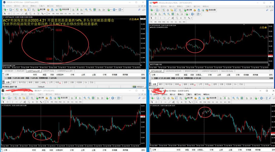 北京时间2020.4.21 5:00 ACY稀万证券的美国原油现货跟其他平台的现货原油一样都收盘了,此前ACY原油的价格跟其他平台报价一样,走势一样,但60分钟后(2020.4.21 6:00)所有平台的原油重新开盘,此时ACY的原油现货报价跟所有平台的原油现货报价发生了重大偏离,直接从15美金跌到13美金,跌幅达到14%,但此时其他所有平台的原油现货都没有跌,只有ACY一家平台暴跌,ACY平台的原油涉嫌恶意篡改报价,导致我的账号MT4:155526于60分钟前建仓的3手原油多头爆仓,亏损6771.85美金,要求ACY平台退还被恶意爆仓亏损的6771.85美金