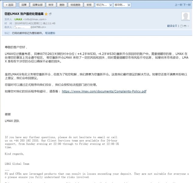 跟lmax和万海代理之间交涉时间比较长了,2019年7月26号到现在,LMAX处理结果是恢复26号被砍掉的道指的历史订单。 但从26号到8月15号得到这个处理结果这段时间里,道指的行情已经距离被砍的原始订单已不止1千多点了。这部分损失他们不赔偿。 也由于被LMAX砍的单子过多 导致剩余仓位的保证金不足以承受市场风险也很快爆仓了。这部分损失LMAX也不予赔偿。 从30号接到LMAX电话 说仓位不能恢复。随后我一直主张赔款。交涉无果的情况下 到8月15号又说能恢复,这不是自己抽自己耳光吗? lmax现在就是一直拖着不处理 所以我把所有的交涉细节 通话录音 聊天记录等都发在了网上。让大家评评理 前车之鉴。