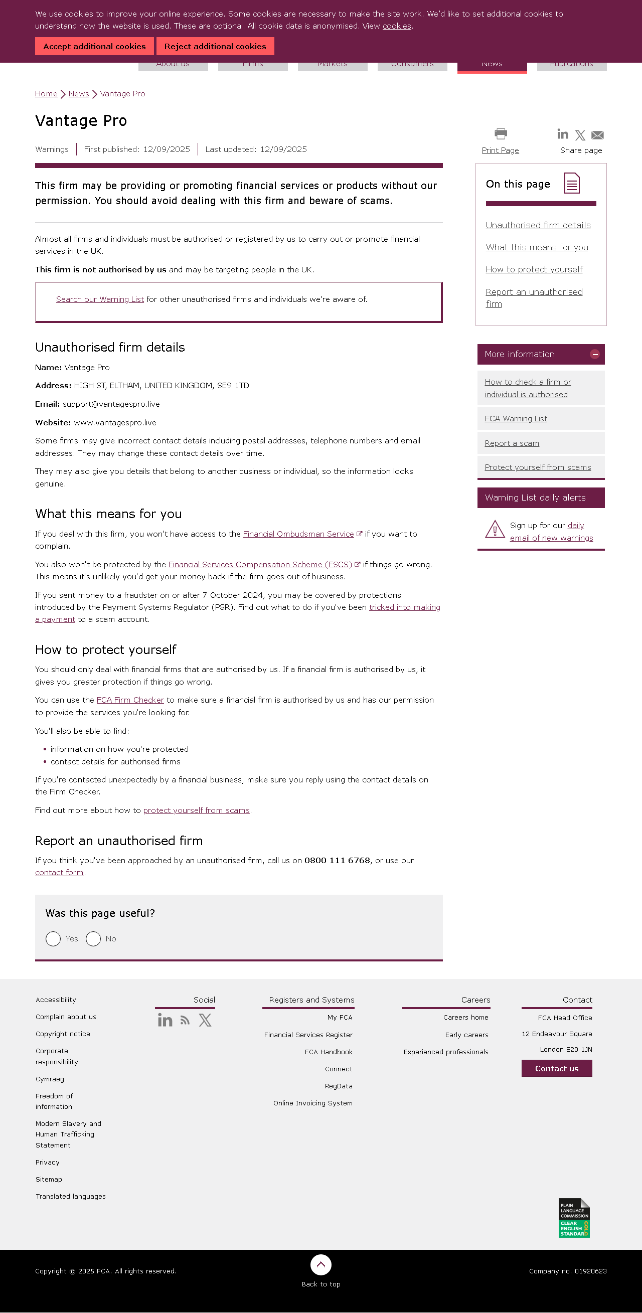 Эта компания может предоставлять или продвигать финансовые услуги или продукты без нашего разрешения. Вам следует избегать сделок с этой компанией и остерегаться мошенничества. Почти все компании и частные лица должны быть авторизованы или зарегистрированы у нас для осуществления или продвижения финансовых услуг в Великобритании. Эта компания не авторизована нами и может нацеливаться на людей в Великобритании. Проверьте наш список предупреждений, чтобы узнать о других неавторизованных компаниях и частных лицах, о которых нам известно. Данные неавторизованной компании Название: Vantage Pro Адрес: HIGH ST, ELTHAM, UNITED KINGDOM, SE9 1TD Email: support@vantagespro.live Веб-сайт: www.vantagespro.live Некоторые компании могут указывать неверные контактные данные, включая почтовые адреса, телефонные номера и адреса электронной почты. Они могут изменять эти контактные данные со временем. Они также могут предоставлять вам данные, которые принадлежат другому бизнесу или индивидуальный, поэтому информация выглядит подлинной."].