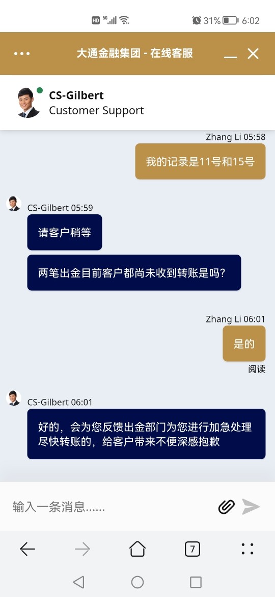 大半个月了,一共3笔出金不到账,最近看都是大通的出金问题,共计2763.13美金的损失!骗子平台!