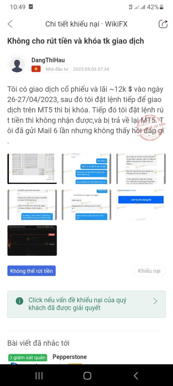 Đã 17 ngày sau khi tôi giao dịch và có lãi ~12000$. Pepper vẫn chưa chịu trả tiền lãi cho tôi mà chỉ cho rút tiền vốn,họ tự ý trừ đi số tiền lãi,khóa tài khoản và chấm dứt hợp đồng. Như tôi đã nói ở 2 lần tố cáo trước,tôi giao dịch trên nền tảng của họ,môi trường,điều kiện,luật chơi của họ thì tôi mới có thể thực thi được lệnh và chốt lệnh ở mức lãi ~12000$. Sau đó phía PepperStone không cho tôi rút số tiền này với lý do hành vi giao dịch bất thường và gian lận. Vậy thì nếu nhà đầu tư giao dịch mà bị lỗ thì đó mới là việc đúng đắn và bình thường hay sao ? Quá vô lý và bất công bằng. Thậm chí tài khoản của tôi đã chuyển sang Pro (là tài khoản mà Pepper có thể chịu số dư âm là -10000$) Nhiều lần gửi mail tiếp theo,phía Pepper báo là đã chuyển đến bộ phận tranh chấp nội bộ IDR (hẹn trước ngày 18/5/2023 sẽ thông tin lại). Nhưng tôi đoán đây cũng chỉ là chiêu trò kéo dài thời gian,đùn đẩy và không giải quyết gì. Nếu thực sự như vậy thì đây là sàn giao dịch cướp tiền của nhà đầu tư,sự uy tín của họ là giả mạo. Tôi vẫn đang kiên nhẫn đợi đến ngày 18/5/2023 để xem kết quả thế nào,