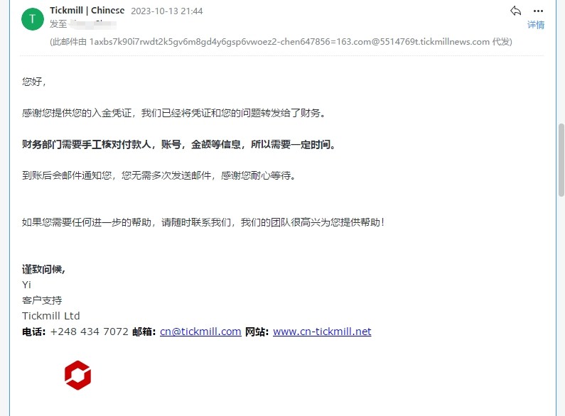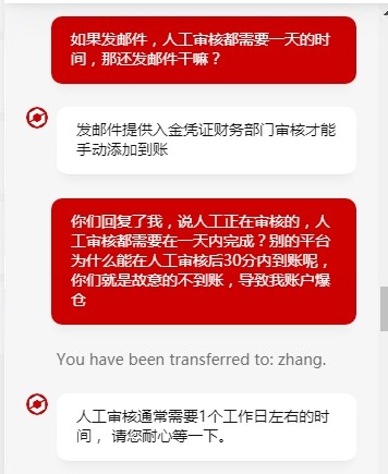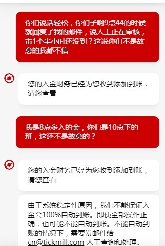 本人Tickmill开的一个账户,MT4:10263378,周五晚上补仓8点40,入金5000美金补仓,当晚一直没到,找了客服还发了邮件,并催促处理下,结果还是未到,导致账户爆仓,资金是周六到的,资金是晚上8点40入的,邮件是晚上9点27发的,对方晚上9点44回复正在人工核实,第二封邮件是晚上11点发的,仓位是晚上11点13开始爆的(中间我还减仓了),从入金到爆仓三个小时,其中找了客服,发了邮件,对方回复正在审核,结果一个小时还没到账,这你说平台不是故意不到账我都不信。 官网客服推脱责任,答非所问,无良平台请远离