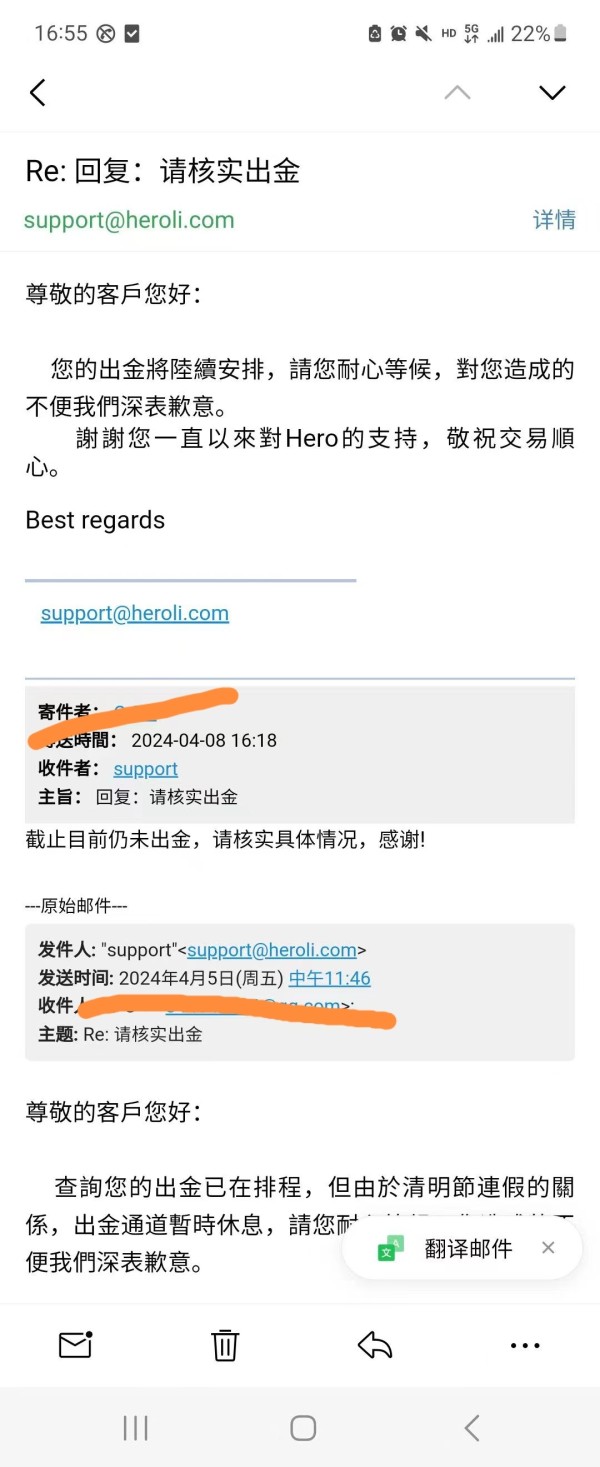3月中旬出金正常到账,月底开始出金延迟,4号和8号分别发邮件咨询过两次,一次回复是节假日出金通道休息,一次是说正在排单,但都一直没到账。目前出入金都有问题,只是出金审核流程正常,邮件有人回复,但资金无法到账
