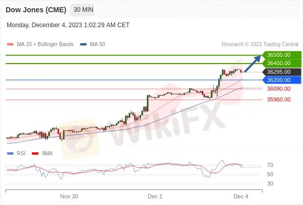 เมื่อวันศุกร์ หุ้นสหรัฐฯ เริ่มซื้อขายในเดือนธันวาคมด้วยสัญญาณที่ดี ค่าเฉลี่ยอุตสาหกรรมดาวโจนส์เพิ่มขึ้น 294 จุด (+0.82%) เป็น 36,245 ซึ่งเป็นระดับสูงสุดในรอบปีจนถึงปัจจุบัน S&P 500 เพิ่มขึ้น 26 จุด (+0.59%) เป็น 4,594 ซึ่งเป็นระดับสูงสุดในปี 2566 และ Nasdaq 100 เพิ่มขึ้น 49 จุด (+0.31%) เป็น 15,997