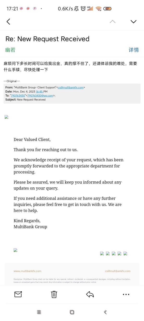 2021年10月开始出不了金,至今已两年时间,在此期间无法出金入金,无人对接出金事宜,发邮件只是回复搪塞,就是不处理,资金由1万美金亏损只剩3000美金。本人由于负债压力巨大,身心焦瘁,身体出现严重问题,心脏要做手术,最后的3000美金还希望给予出金,付医疗费!