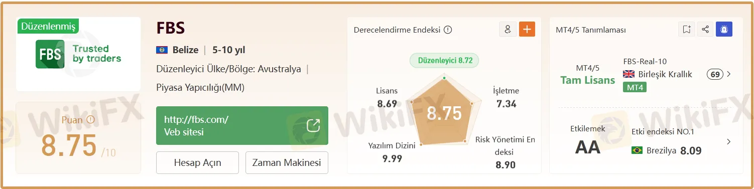 FBS, 2009 yılında faaliyetlerine başlayan uluslararası alanda tanınan bir çevrimiçi forex ve CFD brokerıdır. Şirketin merkezi Belize'dedir ve IFSC Belize'nin düzenlemesi altında faaliyet göstererek güvenli ve düzenlenmiş bir ticaret ortamı sağlar. FBS, hizmetlerini küresel olarak başarıyla genişletmiş ve 30'dan fazla ülkede 20 milyondan fazla kullanıcıya ulaşmıştır. Çok çeşitli alım satım varlıkları sunan aracı şirket, hızlı ve güvenilir emir gerçekleştirme sağlamayı taahhüt etmektedir. Daha ayrıntılı sorular veya yardım için müşteriler cs.global@gmimarkets.com adresinden e-posta yoluyla FBS ile iletişime geçebilir veya web sitesindeki ulaşım kanallarını kullanabilirsiniz.