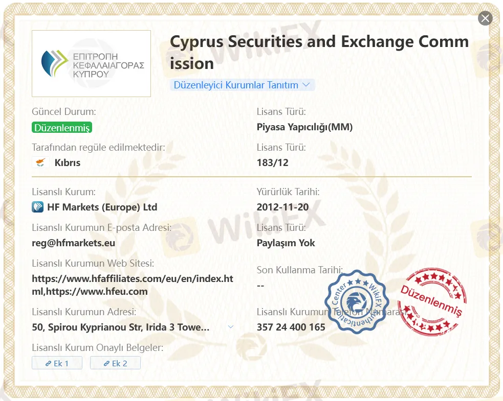 Kıbrıs Menkul Kıymetler ve Borsa Komisyonu (CySEC): HF Markets (Europe) Ltd, 183/12 düzenleyici lisans numarasıyla CySEC tarafından düzenlenir ve ayrıca 3427 lisans numarasıyla CNMV tarafından düzenlenir.