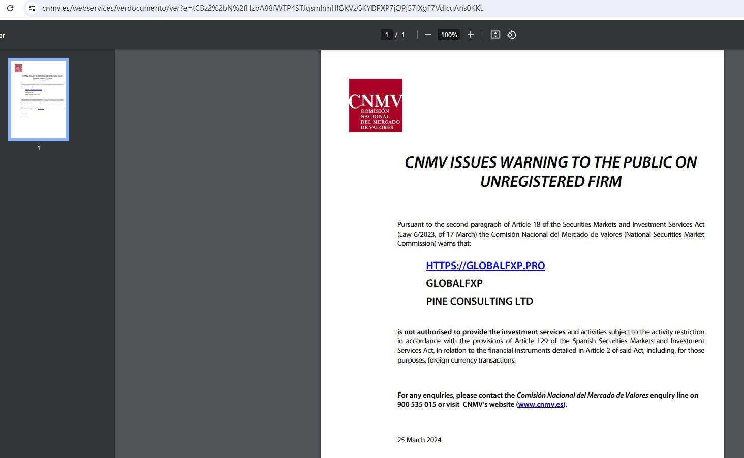 cnmv, menkul kıymetler piyasaları ve yatırım hizmetleri kanununun (17 Mart tarihli 6/2023 sayılı yasa) 18. maddesinin ikinci paragrafı uyarınca kayıtsız firma konusunda kamuoyuna uyarıda bulunurken, comisión nacional del mercado de valores (ulusal menkul kıymetler piyasası komisyonu) şu uyarıda bulunuyor: : https:// GlobalFxp .pro GlobalFxp pine Consulting Ltd.'nin, İspanya Menkul Kıymet Piyasaları ve Yatırım Hizmetleri Kanunu'nun 129. maddesi hükümleri uyarınca, söz konusu kanunun 2. maddesinde ayrıntıları verilen finansal araçlarla ilgili olarak, faaliyet kısıtlamasına tabi yatırım hizmetleri ve faaliyetlerini sağlamaya yetkili olmadığı, bu amaçlar doğrultusunda döviz işlemleri de dahil. Sorularınız için lütfen 900 535 015 numaralı telefondan Comisión Nacional del Mercado de Valores sorgulama hattıyla iletişime geçin veya cnmv'nin web sitesini (www.cnmv.es) ziyaret edin. 25 Mart 2024
