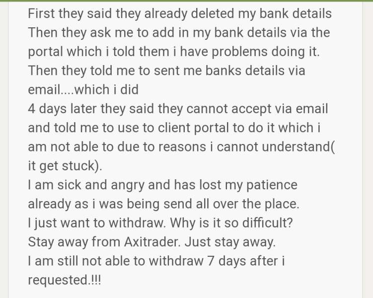 A client has complained that he cannot withdraw his funds from Axi and Axi is giving many excuses for failure of withdrawal. He may have lost all his money. Stay away from Axi.