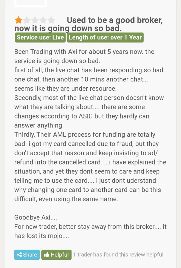 A client has complained about the poor response of live chat of axi and that they do not solve clients' issues properly now like they used to.