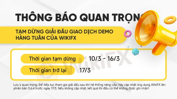Nhằm mang đến một sân chơi giao dịch mô phỏng chuyên nghiệp hơn, WikiFX sẽ tạm dừng giải đấu giao dịch mô phỏng hàng tuần từ ngày 10/3 đến 16/3 để thực hiện nâng cấp hệ thống. Đừng lo lắng! Giải đấu sẽ quay trở lại vào ngày 17/3 với hàng loạt cải tiến hấp dẫn giúp bạn có trải nghiệm mượt mà, chính xác và hiệu quả hơn.