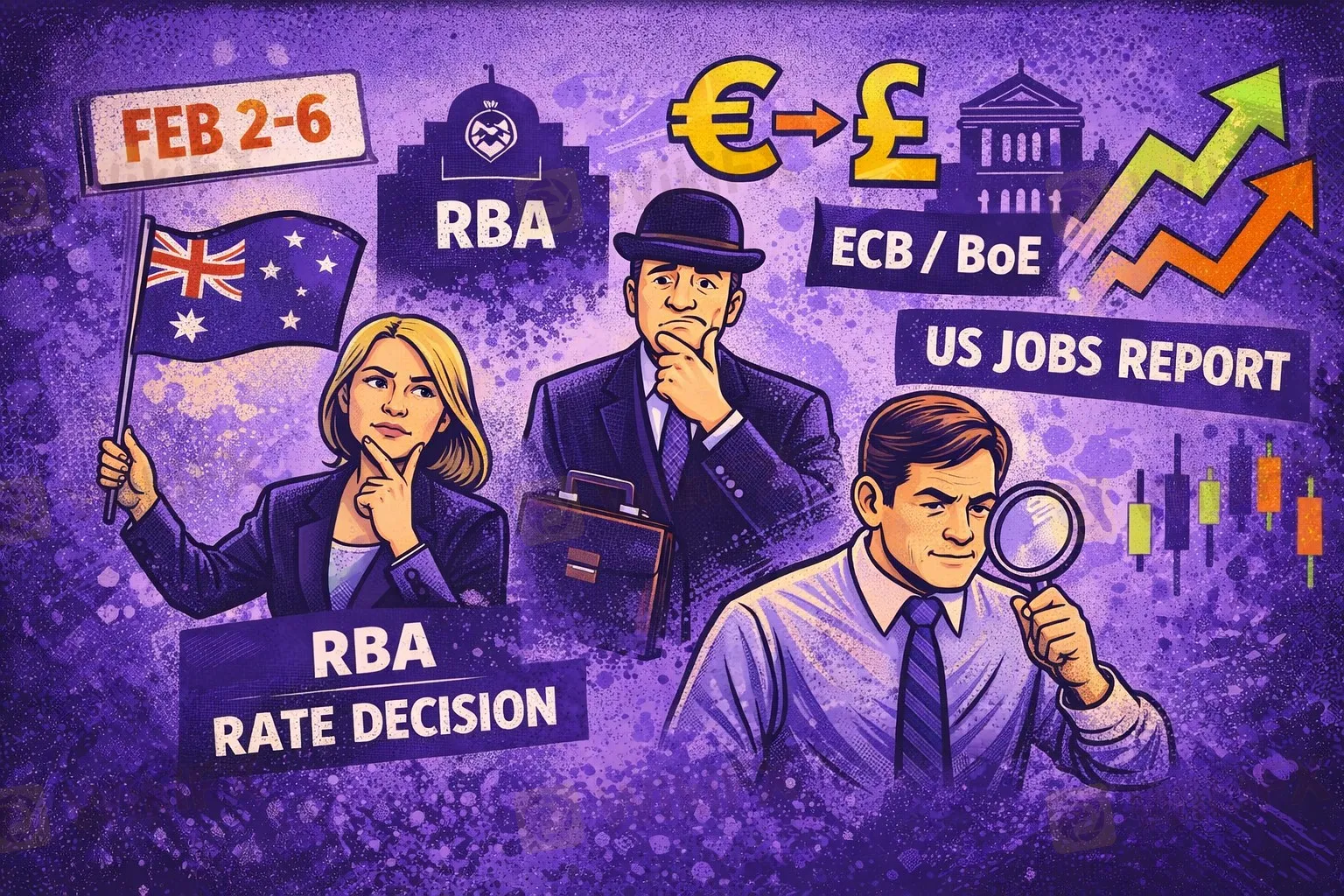 Ngân hàng Dự trữ Australia (RBA) họp vào ngày 3/2, Ngân hàng Anh (BoE) vào ngày 5/2 và Ngân hàng Trung ương Châu Âu (ECB) cũng vào ngày 5/2. Kỳ vọng chung từ giới phân tích cho thấy một động thái hiếm hoi: RBA có thể sẽ tăng lãi suất trong khi BoE và ECB dự kiến sẽ giữ nguyên.