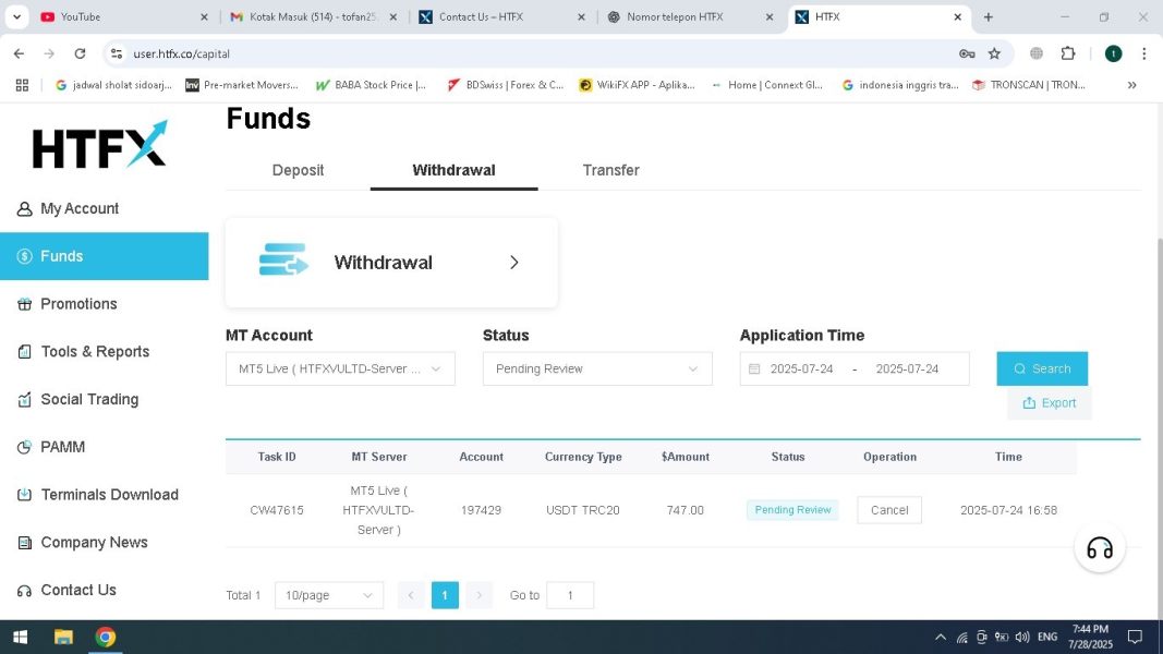 I submitted a withdrawal request of $747 USDT (TRC20) on July 24, 2025 via the HTFX platform (user.htfx.co). Today is July 28, and the status is still stuck on "Pending Review", with no updates or transfers received on my wallet.