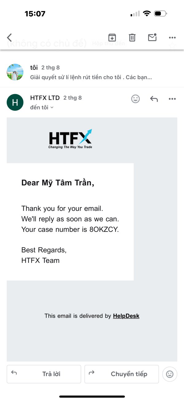 Tôi tên là : Trần thị Tâm hiện đang sinh sống và làm việc tại Việt Nam. Tôi mở tài khoản giao dịch tại sàn HTFX từ khoảng tháng 05/2025 Gần đây nhất tôi có nạp tiền vào sàn Htfx để giao dịch nhưng sau một vài tháng giao dịch không hiệu quả , nên tôi quyết định làm lệnh rút tiền. Ngày 11/07/2025, tôi tiến hành làm lệnh rút tổng số tiền 5.000 USD từ tài khoản giao dịch về tài khoản ngân hàng cá nhân. Tuy nhiên, đến nay (ngày 3/08/2025), lệnh rút vẫn chưa được xử lý dù tôi không vi phạm bất kỳ quy định nào của sàn, không nhận được lý do rõ ràng hay bất kỳ phản hồi chính thức nào từ phía HTFX. Tôi đã gửi nhiều email và tin nhắn yêu cầu giải thích, nhưng đều bị phớt lờ hoặc trả lời vòng vo, không cung cấp thông tin cụ thể về thời gian xử lý rút tiền. Điều này khiến tôi nghi ngờ sàn HTFX có dấu hiệu chiếm dụng vốn của nhà đầu tư, không đảm bảo quyền lợi hợp pháp cho khách hàng. Tôi kính đề nghị WikiFX xác minh, hỗ trợ xử lý và cảnh báo sớm về dấu hiệu bất thường của sàn HTFX