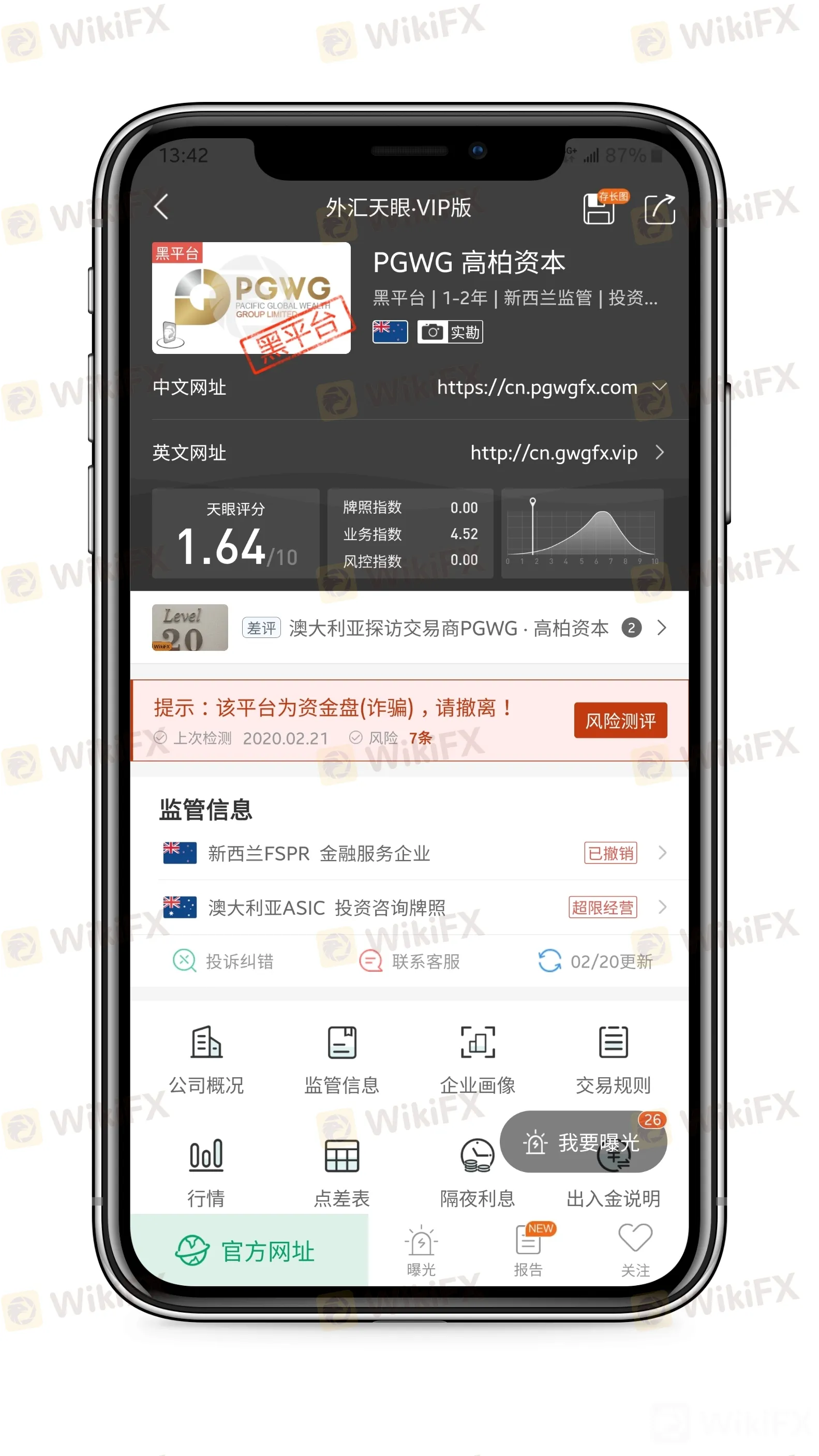 PGWG高柏,天眼评分1.6 4分,其所持的FSP授权牌照已被撤销,ASIC授权投资咨询牌照无从事外汇经纪业务的权限。且该交易所当前存在大量客诉,目前已被明显标注“黑平台”。建议投资者远离!