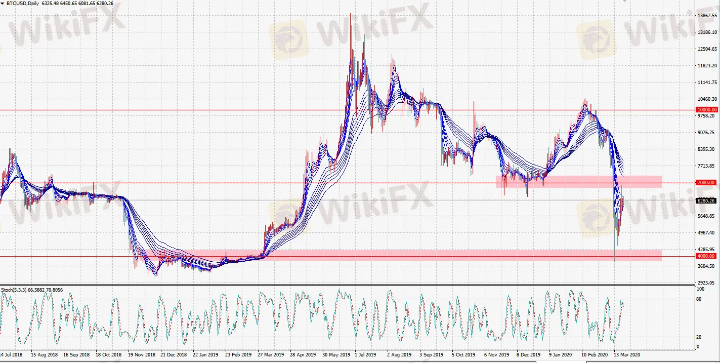 本周BTC行情阴阳交错式向上展开,反弹偏犹豫,多头意欲上攻7000受阻,在6880时快速回撤,跌破6000后又迅速反弹,市场在寻找合理的波动区间。日线级别,3月12日的暴跌击穿了19年12月的密集成交区,7000一带作为曾经的支撑大概率会转化为新的阻力。
