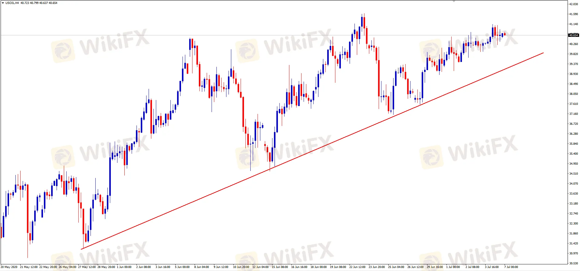 【技术点评】:H4周期显示,油价沿上升趋势线上行,价格低点逐渐走高。
