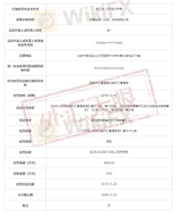 2017年8月,环迅支付因其违反支付业务规定,被央行上海总部没收违法所得28.57万元,并处以罚款150万元,共计178.57万元。