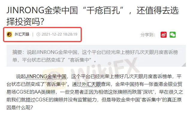 在黄金市场中,大大小小的平台不计其数,如何选择一个靠谱的平台显得尤为重要。近期外汇天眼收到的各类关于黄金投资平台的曝光日益增多。其中,JINRONG ·金荣中国近3个月内外汇天眼收到对该交易商的投诉曝光已达到81条,涉及问题主要是不能出金,诱导投资造成巨大损失等。其实早在2021年外汇天眼就曾经针对金荣中国的“恶行”进行过报道!原文(https://www.fxeye168.com/202112229214404943.html)